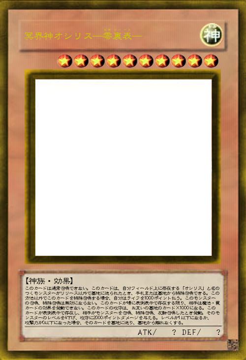 | このカードは通常召喚できない。このカードは、自分フィールド上に存在する「オシリス」と名のつくモンスターがリリース以外で墓地に送られたとき、手札または墓地から特殊召喚できる。この方法以外でこのカードを特殊召喚する場合、自分はライフを1000ポイント払う。このモンスターの召喚、特殊召喚は無効にならない。このカードが場に表側表示で存在する限り、相手は魔法・罠カードの効果を発動できない。このカードの攻守は、お互いの墓地のカード×1000になる。このカードが表側表示で存在し、相手がモンスターを召喚、特殊召喚、反転召喚したとき発動。そのモンスターのレベルを4下げ、攻守に2000ポイントダメージを与える。レベルが1以下になるか、攻撃力が0以下になった場合、そのカードを墓地に送り、墓地から離れなくする。 | |||