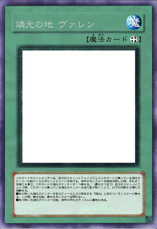 このカードのコントローラーは、自分のスタンバイフェイズごとにこのカードに乗っている燐光カウンターの数×100ポイントダメージを受ける。相手がモンスターを特殊召喚した時、手札を1枚捨てる事で、このカードに燐光カウンターを1つ乗せる。(最大3つまで)自分のスタンバイフェイズ時、このカードに乗っている燐光カウンターを全て取り除くことで、以下の効果から選んで発動する。 ●取り除いた燐光カウンターを自分フィールド上に存在する「燐光」と名のつくモンスターに乗せる。この際、乗せる数、乗せるモンスターは問わない。 ●取り除いた燐光カウンターの数、相手の手札をランダムに墓地に送る。 |