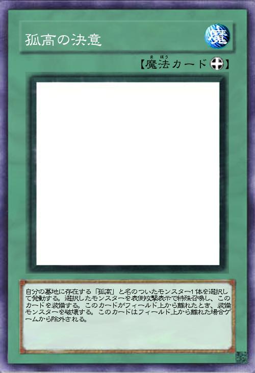 | 自分の墓地に存在する「孤高」と名のついたモンスター1体を選択して発動する。選択したモンスターを表側攻撃表示で特殊召喚し、このカードを装備する。このカードがフィールド上から離れたとき、装備モンスターを破壊する。このカードはフィールド上から離れた場合ゲームから除外される。 | |||