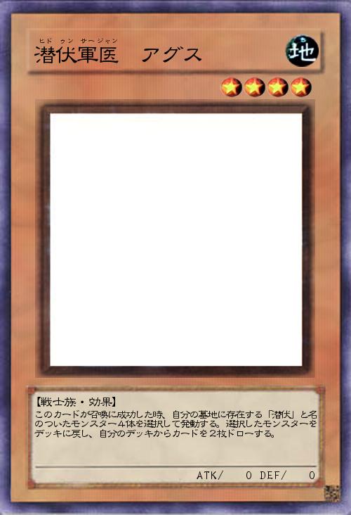 | このカードが召喚に成功した時、自分の墓地に存在する「潜伏」と名のついたモンスター4体を選択して発動する。選択したモンスターをデッキに戻し、自分のデッキからカードを2枚ドローする。 | |||