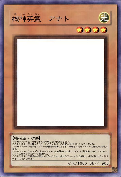 このモンスターは、可能であれば攻撃しなければならない。 このモンスターが攻撃するとき、このモンスターの攻撃力は500ポイントアップする。 このモンスターが相手モンスターを戦闘で破壊したとき、破壊されたモンスターは持ち主の手札に戻る。 このモンスターがレベル7以上のモンスターと戦闘を行う場合、ダメージ計算を行わず、このモンスターと相手モンスターを破壊する。 このモンスターが破壊され墓地へ送られたとき、自分のデッキから「機神」と名の付いたモンスターを1体手札に加える。 |