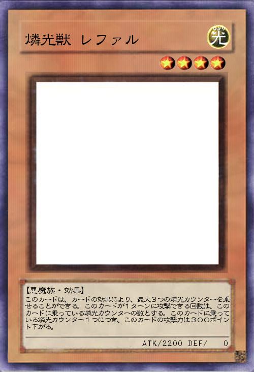 | このカードは、カードの効果により、最大3つの燐光カウンターを乗せることができる。このカードが1ターンに攻撃できる回数は、このカードに乗っている燐光カウンターの数とする。このカードに乗っている燐光カウンター1つにつき、このカードの攻撃力は300ポイント下がる。 | |||