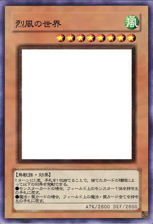 1ターンに1度、手札を1枚捨てることで、捨てたカードの種類によって以下の効果を発動できる。 ●モンスターカードの場合、フィールド上のモンスター1体を持ち主の手札に戻す。 ●魔法・罠カードの場合、フィールド上の魔法・罠カード全てを持ち 主の手札に戻す。 |