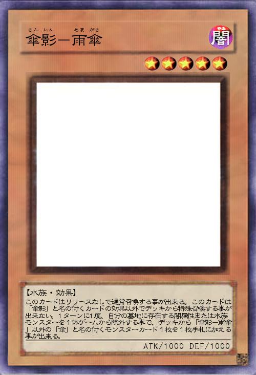 | このカードはリリースなしで通常召喚する事が出来る。このカードは「傘影」と名の付くカードの効果以外でデッキから特殊召喚する事が出来ない。1ターンに1度、自分の墓地に存在する闇属性または水族モンスターを1体ゲームから除外する事で、デッキから「傘影-雨傘」以外の「傘」と名の付くモンスターカード1枚を1枚手札に加える事が出来る。 | |||