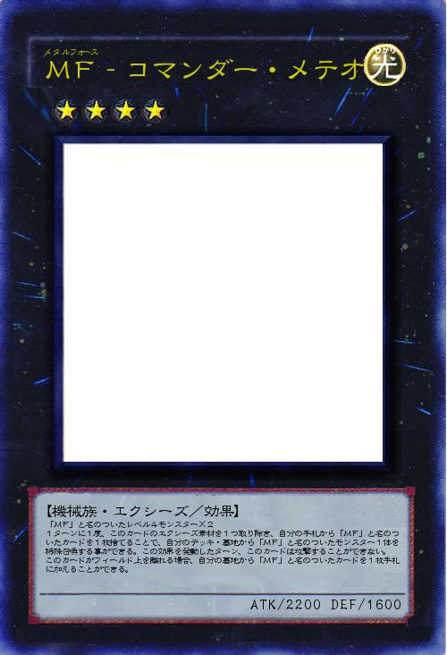 「MF」と名のついたレベル4モンスター×2 1ターンに1度、このカードのエクシーズ素材を1つ取り除き、自分の手札から「MF」と名のついたカードを1枚捨てることで、自分のデッキ・墓地から「MF」と名のついたモンスター1体を特殊召喚する事ができる。この効果を発動したターン、このカードは攻撃することができない。 このカードがフィールド上を離れる場合、自分の墓地から「MF」と名のついたカードを1枚手札に加えることができる。 |