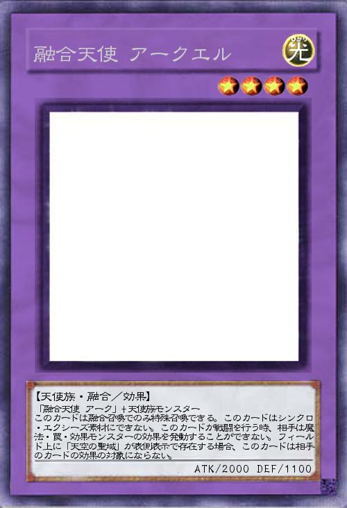 「融合天使 アーク」+天使族モンスター このカードは融合召喚でのみ特殊召喚できる。このカードはシンクロ・エクシーズ素材にできない。このカードが戦闘を行う時、相手は魔法・罠・効果モンスターの効果を発動することができない。フィールド上に「天空の聖域」が表側表示で存在する場合、このカードは相手のカードの効果の対象にならない。 |