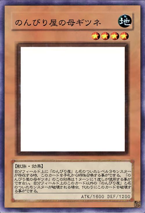 | 自分フィールド上に「のんびり屋」と名のついたレベル3モンスターが存在する時、このカードを手札から特殊召喚する事ができる。「のんびり屋の母ギツネ」のこの効果は1ターンに1度しか使用する事ができない。自分フィールド上のこのカード以外の「のんびり屋」と名のついたモンスターが破壊される場合、代わりにこのカードを破壊する事ができる。 | |||