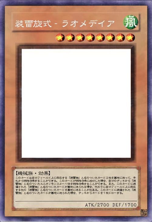 | このカードは自分フィールド上に存在する「装雷旋」と名のついたカード2枚を墓地に送って、手札から特殊召喚することができる。このカードが特殊召喚に成功した場合、自分のデッキから「装雷旋」と名のついたユニオンモンスター1体を特殊召喚することができる。また、このカードに装備された「装雷旋」と名のついたカードが墓地に送られる場合、代わりに自分フィールド上に存在する他の「装雷旋」と名のついたカードを墓地に送ることが出来る。このカードに装備された「装雷旋」と名のついたカードが墓地に送られた場合、デッキからカードを1枚ドローする。 | |||