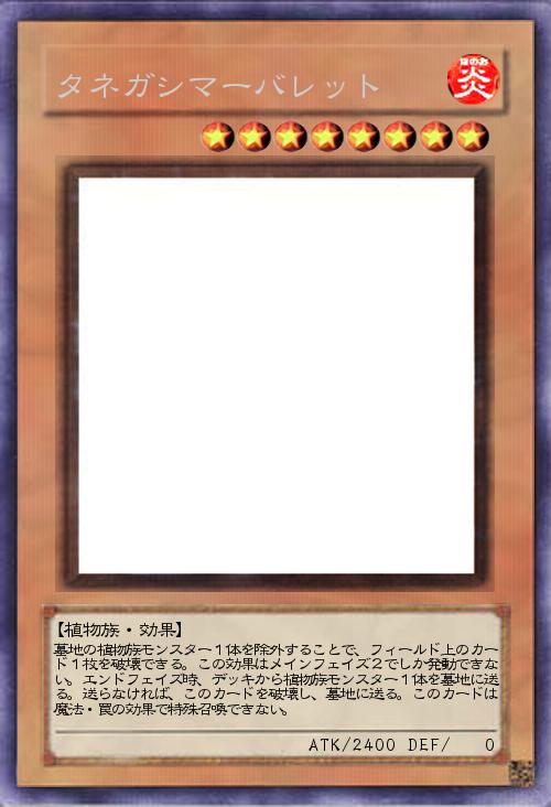 | 墓地の植物族モンスター1体を除外することで、フィールド上のカード1枚を破壊できる。この効果はメインフェイズ2でしか発動できない。エンドフェイズ時、デッキから植物族モンスター1体を墓地に送る。送らなければ、このカードを破壊し、墓地に送る。このカードは魔法・罠の効果で特殊召喚できない。 | |||