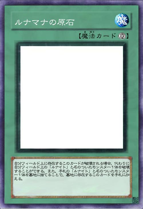 「第1弾。ルナイトの魔力の生み出す原石(という設定)。上記の説明と効果からなんとなく察してるかと思いますが、要はコアキメイルのアレです。あちらよりデッキを組む意義があるカテゴリにはする予定でございます。」(2013-04-05 13:07)