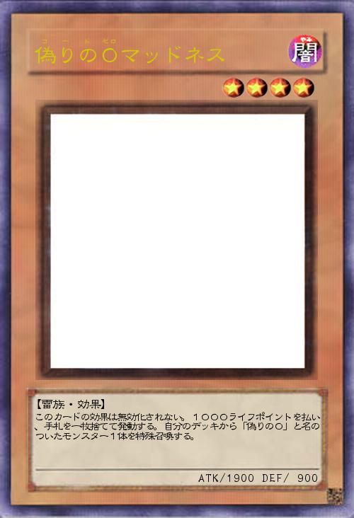 | このカードの効果は無効化されない。1000ライフポイントを払い、手札を一枚捨てて発動する。自分のデッキから「偽りの0」と名のついたモンスター1体を特殊召喚する。 | |||