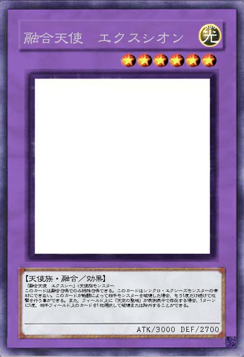 「融合天使 エクスシー」+天使族モンスター このカードは融合召喚でのみ特殊召喚できる。このカードはシンクロ・エクシーズモンスターの素材にできない。このカードが戦闘によって相手モンスターを破壊した場合、もう1度だけ続けて攻撃を行う事ができる。また、フィールド上に「天空の聖域」が表側表示で存在する場合、1ターンに1度、相手フィールド上のカードを1枚選択して破壊または除外することができる。 |