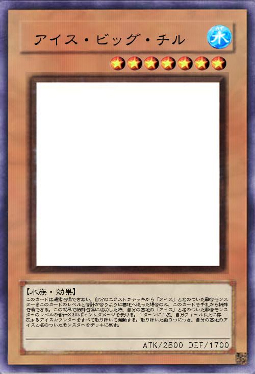 | このカードは通常召喚できない。自分のエクストラデッキから「アイス」と名のついた融合モンスターをこのカードのレベルと合計が合うように墓地へ送った場合のみ、このカードを手札から特殊召喚できる。この効果で特殊召喚に成功した時、自分の墓地の「アイス」と名のついた融合モンスターのレベルの合計×200ポイントダメージを受ける。1ターンに1度、自分フィールド上に存在するアイスカウンターをすべて取り除いて発動する。取り除いた数3つにつき、自分の墓地のアイスと名のついたモンスターをデッキに戻す。 | |||