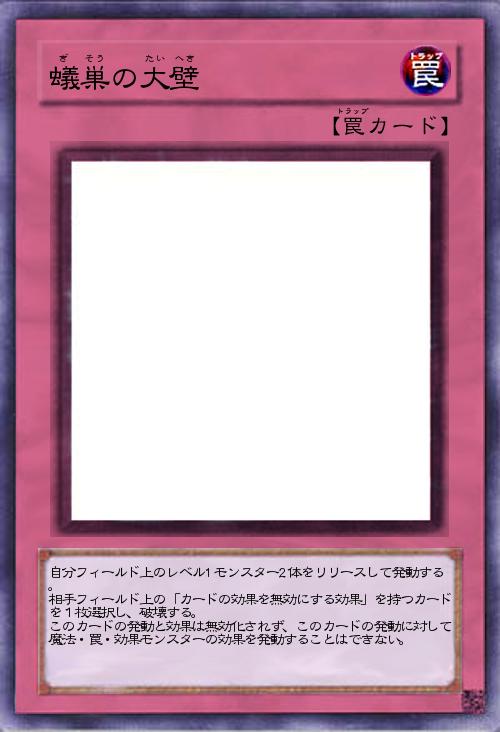 自分フィールド上のレベル1モンスター2体をリリースして発動する。 相手フィールド上の「カードの効果を無効にする効果」を持つカードを1枚選択し、破壊する。 このカードの発動と効果は無効化されず、このカードの発動に対して魔法・罠・効果モンスターの効果を発動することはできない。 |