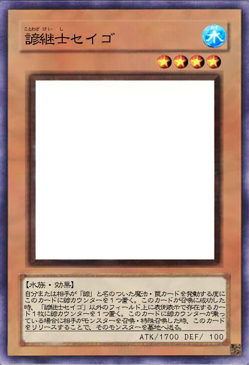 | 自分または相手が「諺」と名のついた魔法・罠カードを発動する度にこのカードに諺カウンターを1つ置く。このカードが召喚に成功した時、「諺継士セイゴ」以外のフィールド上に表側表示で存在するカード1枚に諺カウンターを1つ置く。このカードに諺カウンターが乗っている場合に相手がモンスターを召喚・特殊召喚した時、このカードをリリースすることで、そのモンスターを墓地へ送る。 | |||