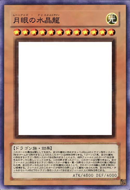 | このカードの属性は闇としても扱う。自分の墓地に存在するレベル8以上のドラゴン族モンスター3体をゲームから除外することでのみこのカードは特殊召喚できる。1ターンに1度、自分の墓地に存在するドラゴン族モンスター1体を除外することにより、相手フィールド上のカード1枚を持ち主のデッキに戻しシャッフルする。この効果を使ったターン、このカードは攻撃できない。自分フィールド上に存在するドラゴン族モンスターが魔法・罠・効果モンスターの効果の対象に選択された時、自分のデッキの上からカードを3枚墓地に送ることで、そのカードの発動と効果を無効にし破壊する。フィールド上のこのカードが相手の効果によって墓地へ送られた時、自分の手札・デッキからレベル8以下のドラゴン族モンスター1体を自分フィールド上に特殊召喚できる。 | |||