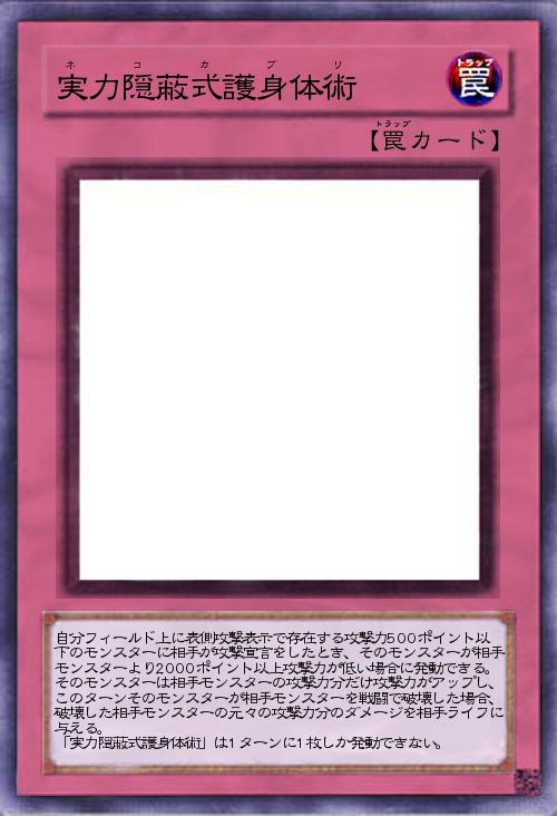 自分フィールド上に表側攻撃表示で存在する攻撃力500ポイント以下のモンスターに相手が攻撃宣言をしたとき、そのモンスターが相手モンスターより2000ポイント以上攻撃力が低い場合に発動できる。 そのモンスターは相手モンスターの攻撃力分だけ攻撃力がアップし、このターンそのモンスターが相手モンスターを戦闘で破壊した場合、破壊した相手モンスターの元々の攻撃力分のダメージを相手ライフに与える。 「実力隠蔽式護身体術」は1ターンに1枚しか発動できない。 |