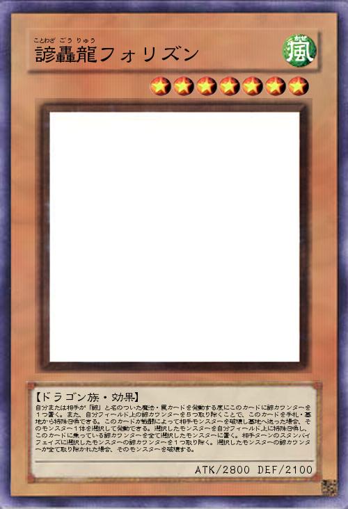 | 自分または相手が「諺」と名のついた魔法・罠カードを発動する度にこのカードに諺カウンターを1つ置く。また、自分フィールド上の諺カウンターを5つ取り除くことで、このカードを手札・墓地から特殊召喚できる。このカードが戦闘によって相手モンスターを破壊し墓地へ送った場合、そのモンスター1体を選択して発動できる。選択したモンスターを自分フィールド上に特殊召喚し、このカードに乗っている諺カウンターを全て選択したモンスターに置く。相手ターンのスタンバイフェイズに選択したモンスターの諺カウンターを1つ取り除く。選択したモンスターの諺カウンターが全て取り除かれた場合、そのモンスターを破壊する。 | |||