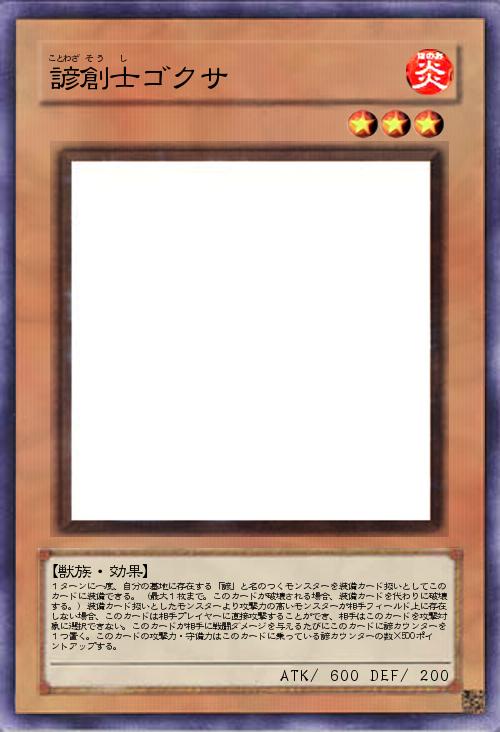 | 1ターンに一度、自分の墓地に存在する「諺」と名のつくモンスターを装備カード扱いとしてこのカードに装備できる。(最大1枚まで。このカードが破壊される場合、装備カードを代わりに破壊する。)装備カード扱いとしたモンスターより攻撃力の高いモンスターが相手フィールド上に存在しない場合、このカードは相手プレイヤーに直接攻撃することができ、相手はこのカードを攻撃対象に選択できない。このカードが相手に戦闘ダメージを与えるたびにこのカードに諺カウンターを1つ置く。このカードの攻撃力・守備力はこのカードに乗っている諺カウンターの数×500ポイントアップする。 | |||