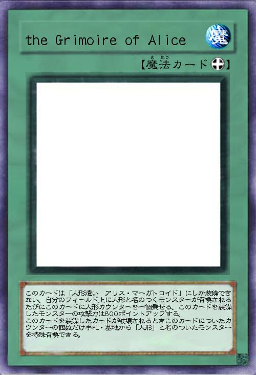 このカードは「人形遣い アリス・マーガトロイド」にしか装備できない、自分のフィールド上に人形と名のつくモンスターが召喚されるたびにこのカードに人形カウンターを一個乗せる、このカードを装備したモンスターの攻撃力は800ポイントアップする。 このカードを装備したカードが破壊されるときこのカードについたカウンターの個数だけ手札・墓地から「人形」と名のついたモンスターを特殊召喚できる。 |