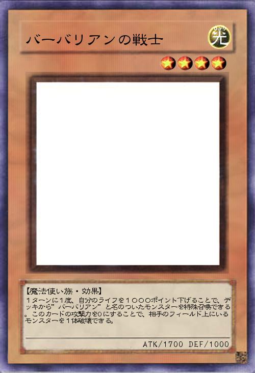 | 1ターンに1度、自分のライフを1000ポイント下げることで、デッキから”バーバリアン”と名のついたモンスターを特殊召喚できる。このカードの攻撃力を0にすることで、相手のフィールド上にいるモンスターを1体破壊できる。 | |||