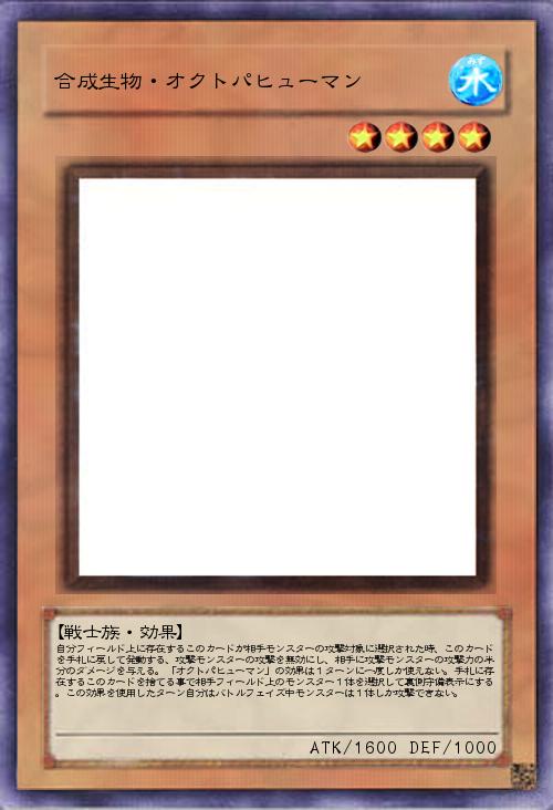 | 自分フィールド上に存在するこのカードが相手モンスターの攻撃対象に選択された時、このカードを手札に戻して発動する、攻撃モンスターの攻撃を無効にし、相手に攻撃モンスターの攻撃力の半分のダメージを与える。「オクトパヒューマン」の効果は1ターンに一度しか使えない。手札に存在するこのカードを捨てる事で相手フィールド上のモンスター1体を選択して裏側守備表示にする。この効果を使用したターン自分はバトルフェイズ中モンスターは1体しか攻撃できない。 | |||