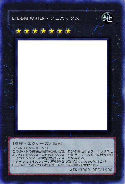レベル6モンスター×3 このカードの特殊召喚に成功した時、自分の墓地からフェニックスと名のつくモンスター以外のモンスターを相手フィールド上に特殊召喚しそのモンスターの攻撃力分のダメージを与える。 1ターンに1度エクシーズ素材を2つ取り除くことでデッキから ETERNALと名のつく魔法カードを一枚選択して発動できる |