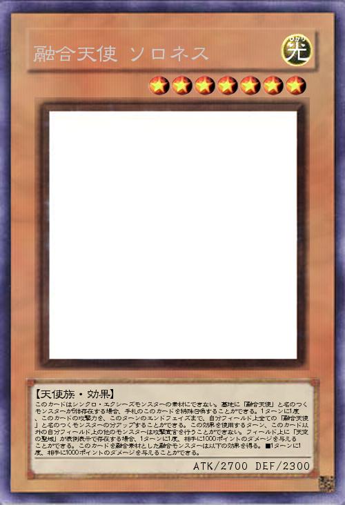 | このカードはシンクロ・エクシーズモンスターの素材にできない。墓地に「融合天使」と名のつくモンスターが5体存在する場合、手札のこのカードを特殊召喚することができる。1ターンに1度、このカードの攻撃力を、このターンのエンドフェイズまで、自分フィールド上全ての「融合天使」と名のつくモンスターの分アップすることができる。この効果を使用するターン、このカード以外の自分フィールド上の他のモンスターは攻撃宣言を行うことができない。フィールド上に「天空の聖域」が表側表示で存在する場合、1ターンに1度、相手に1000ポイントのダメージを与えることができる。このカードを融合素材とした融合モンスターは以下の効果を得る。■1ターンに1度、相手に1000ポイントのダメージを与えることができる。 | |||