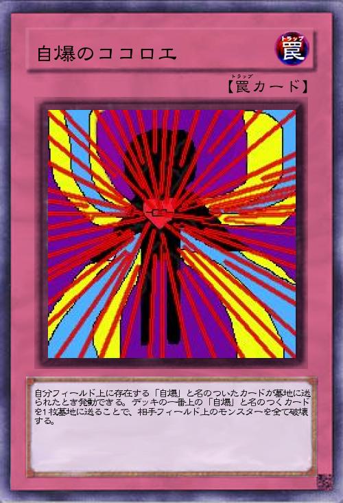 | 自分フィールド上に存在する「自爆」と名のついたカードが墓地に送られたとき発動できる。デッキの一番上の「自爆」と名のつくカードを1枚墓地に送ることで、相手フィールド上のモンスターを全て破壊する。 | |||