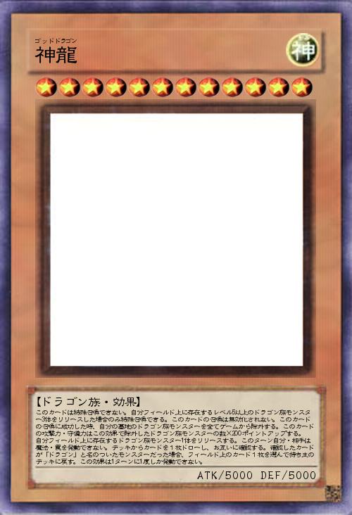 | このカードは特殊召喚できない。自分フィールド上に存在するレベル5以上のドラゴン族モンスター3体をリリースした場合のみ特殊召喚できる。このカードの召喚は無効化されない。このカードの召喚に成功した時、自分の墓地のドラゴン族モンスターを全てゲームから除外する。このカードの攻撃力・守備力はこの効果で除外したドラゴン族モンスターの数×200ポイントアップする。自分フィールド上に存在するドラゴン族モンスター1体をリリースする。このターン自分・相手は魔法・罠を発動できない。デッキからカードを1枚ドローし、お互いに確認する。確認したカードが「ドラゴン」と名のついたモンスターだった場合、フィールド上のカード1枚を選んで持ち主のデッキに戻す。この効果は1ターンに1度しか発動できない。 | |||