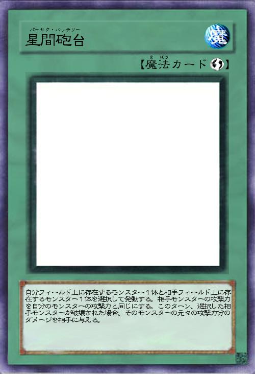 | 自分フィールド上に存在するモンスター1体と相手フィールド上に存在するモンスター1体を選択して発動する。相手モンスターの攻撃力を自分のモンスターの攻撃力と同じにする。このターン、選択した相手モンスターが破壊された場合、そのモンスターの元々の攻撃力分のダメージを相手に与える。 | |||