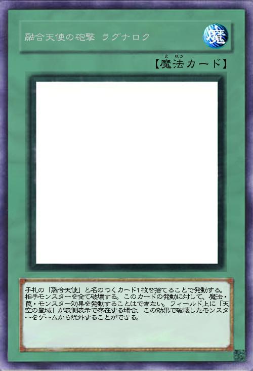 | 手札の「融合天使」と名のつくカード1枚を捨てることで発動する。相手モンスターを全て破壊する。このカードの発動に対して、魔法・罠・モンスター効果を発動することはできない。フィールド上に「天空の聖域」が表側表示で存在する場合、この効果で破壊したモンスターをゲームから除外することができる。 | |||