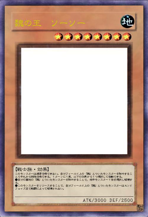 このモンスターは通常召喚できない。自分フィールド上の「魏」とついたモンスターを除外することで手札から特殊召喚できる。1ターンに1度、以下の効果から1つ選択して発動できる。 ●自分の墓地の「魏」とついたモンスターを除外することで、相手モンスター1体を選択し破壊する。 ●このモンスターをリリースすることで、自分フィールド上の「魏」とついたモンスターはエンドフェイズまで戦闘によって破壊されない。 |