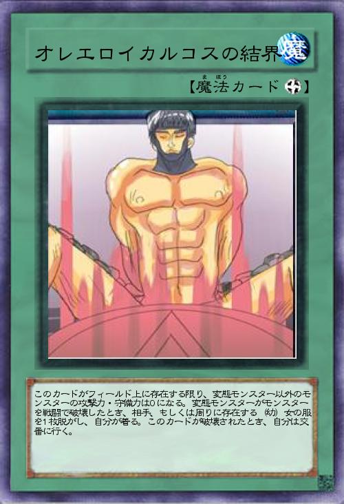 | このカードがフィールド上に存在する限り、変態モンスター以外のモンスターの攻撃力・守備力は0になる。変態モンスターがモンスターを戦闘で破壊したとき、相手、もしくは周りに存在する(幼)女の服を1枚脱がし、自分が着る。このカードが破壊されたとき、自分は交番に行く。 | |||