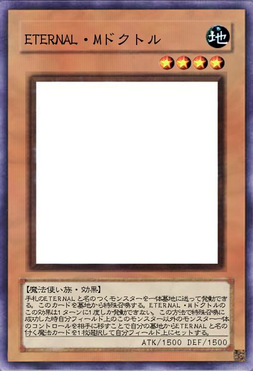 | 手札のETERNALと名のつくモンスターを一体墓地に送って発動できる。このカードを墓地から特殊召喚する。ETERNAL・Mドクトルのこの効果は1ターンに1度しか発動できない。この方法で特殊召喚に成功した時自分フィールド上のこのモンスター以外のモンスター一体のコントロールを相手に移すことで自分の墓地からETERNALと名の付く魔法カードを1枚選択して自分フィールド上にセットする。 | |||