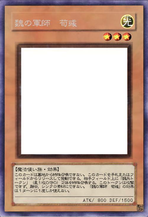 | このカードは墓地から特殊召喚できない。このカードを手札またはフィールドからリリースして発動できる。相手フィールド上に「魏兵トークン」(星1攻0守0)2体を特殊召喚する。このトークンは攻撃できず、融合、シンクロ素材にできない。「魏の軍師 荀彧」の効果は1ターンに1度しか使えない。 | |||
