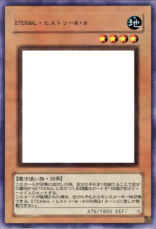 このカードが召喚に成功した時、自分の手札を1枚捨てることで自分の墓地からETERNALと名のつく永続魔法カードを1枚選び自分フィールド上にセットする。 このカードが破壊された場合、自分の手札からモンスターを一体召喚できる。ETERNAL・ヒストリーM・Nの効果は1ターンに1度しか発動できない。 |