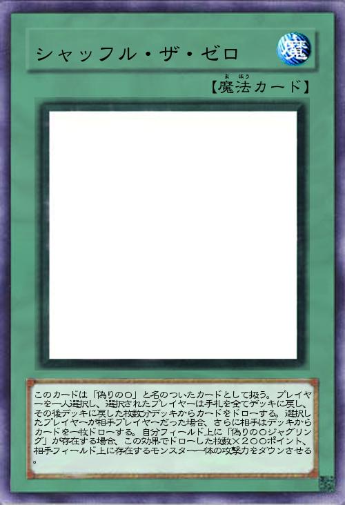 | このカードは「偽りの0」と名のついたカードとして扱う。プレイヤーを一人選択し、選択されたプレイヤーは手札を全てデッキに戻し、その後デッキに戻した枚数分デッキからカードをドローする。選択したプレイヤーが相手プレイヤーだった場合、さらに相手はデッキからカードを一枚ドローする。自分フィールド上に「偽りの0ジャグリング」が存在する場合、この効果でドローした枚数×200ポイント、相手フィールド上に存在するモンスター一体の攻撃力をダウンさせる。 | |||