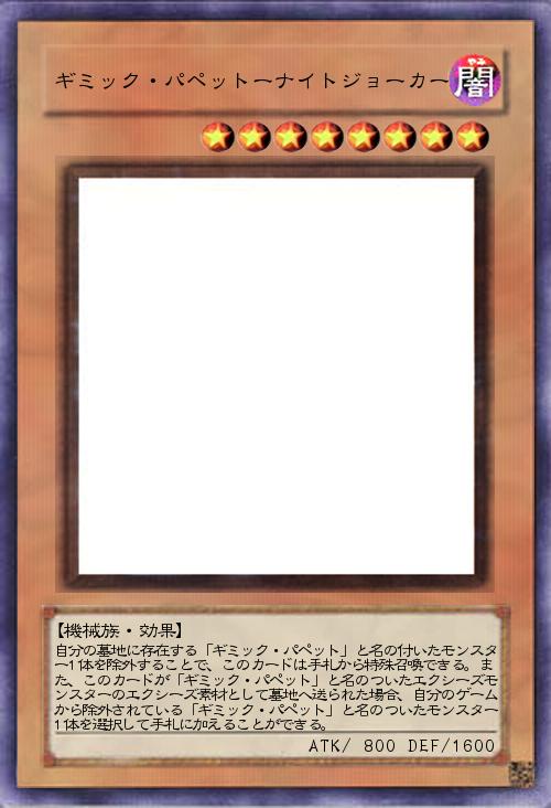 | 自分の墓地に存在する「ギミック・パペット」と名の付いたモンスター1体を除外することで、このカードは手札から特殊召喚できる。また、このカードが「ギミック・パペット」と名のついたエクシーズモンスターのエクシーズ素材として墓地へ送られた場合、自分のゲームから除外されている「ギミック・パペット」と名のついたモンスター1体を選択して手札に加えることができる。 | |||
