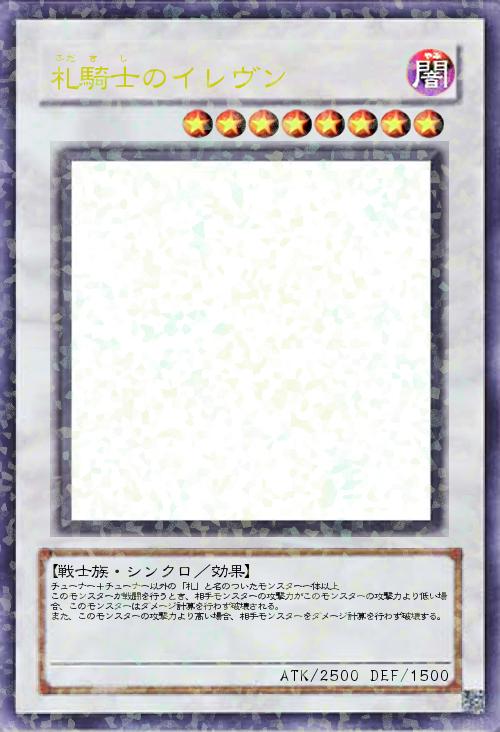 チューナー+チューナー以外の「札」と名のついたモンスター一体以上 このモンスターが戦闘を行うとき、相手モンスターの攻撃力がこのモンスターの攻撃力より低い場合、このモンスターはダメージ計算を行わず破壊される。 また、このモンスターの攻撃力より高い場合、相手モンスターをダメージ計算を行わず破壊する。 |