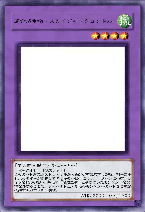 「ビーグル」+「ウズラット」 このカードがエクストラデッキから融合召喚に成功した時。相手の手札二枚を相手が選択してデッキの一番上に戻す。1ターンに一度、ライフを1000払い、墓地の「合成生物」と名のついたモンスターを2体除外することで、フィールド上・墓地のモンスターカードを合成3枚持ち主のデッキに戻す。 |