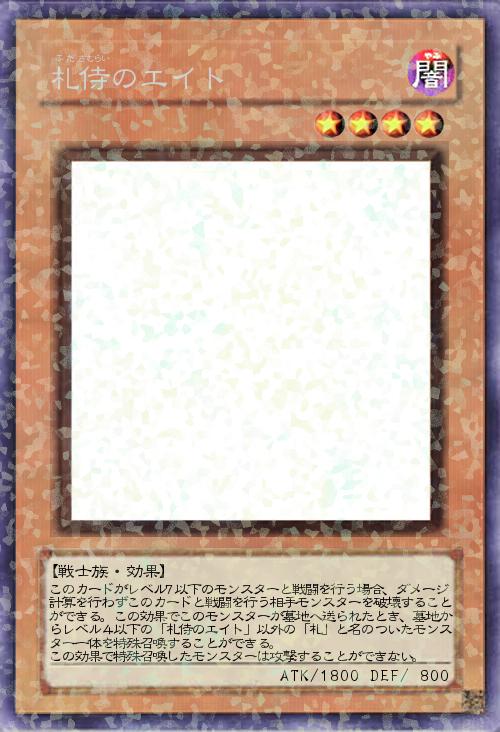 このカードがレベル7以下のモンスターと戦闘を行う場合、ダメージ計算を行わずこのカードと戦闘を行う相手モンスターを破壊することができる。この効果でこのモンスターが墓地へ送られたとき、墓地からレベル4以下の「札侍のエイト」以外の「札」と名のついたモンスター一体を特殊召喚することができる。 この効果で特殊召喚したモンスターは攻撃することができない。 |