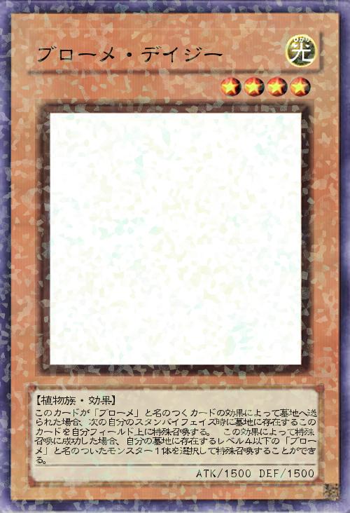 | このカードが「ブローメ」と名のつくカードの効果によって墓地へ送られた場合、次の自分のスタンバイフェイズ時に墓地に存在するこのカードを自分フィールド上に特殊召喚する。 この効果によって特殊召喚に成功した場合、自分の墓地に存在するレベル4以下の「ブローメ」と名のついたモンスター1体を選択して特殊召喚することができる。 | |||