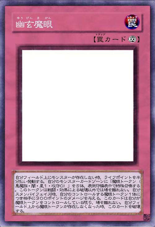 | 自分フィールド上にモンスターが存在しない時、ライフポイントを半分払い発動する。自分のモンスターカードゾーンに「魔眼トークン(悪魔族・闇・星1・攻守0)」を5体、表側守備表示で特殊召喚する。このトークンは戦闘・効果による破壊以外では場を離れない。自分スタンバイフェイズ時、自分のコントロールする魔眼トークン1体につき相手に300ポイントのダメージを与える。このカードは自分が魔眼トークンをコントロールしている限り、場を離れない。自分フィールド上から魔眼トークンが存在しなくなった時、このカードを破壊する。 | |||