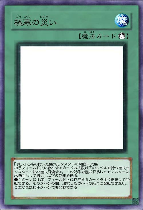 「災い」と名の付いた儀式モンスターの降臨に必要。 相手フィールド上に存在するカードの枚数以下のレベルを持つ儀式モンスター1体を儀式召喚する。この効果で儀式召喚したモンスターは水属性として扱い、以下の効果を得る。 ●1ターンに1度、フィールド上に存在するカードを1枚選択して発動できる。そのターンの間、選択したカードの効果は発動できない。この効果は相手ターンでも発動できる。 |