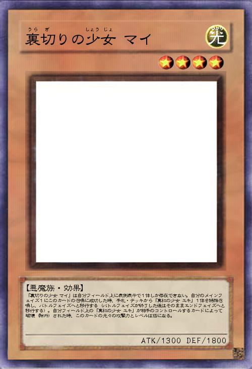 | 「裏切りの少女 マイ」は自分フィールド上に表側表示で1体しか存在できない。自分のメインフェイズ1にこのカードの召喚に成功した時、手札・デッキから「真紅の少女 ユキ」1体を特殊召喚し、バトルフェイズへと移行する(バトルフェイズが終了した後はそのままエンドフェイズへと移行する)。自分フィールド上の「真紅の少女 ユキ」が相手のコントロールするカードによって破壊(除外)された時、このカードの元々の攻撃力とレベルは倍になる。 | |||