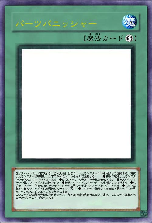 合成生物「俺のパーツを超えて行け!」 と言う事で結構厄介な程にフィールドから手札、デッキから墓地に至るまで引っ掻き回して生命を断ちます。お互いのカードをデッキに戻す効果はデッキに三枚までしか入らない「融合成」を回収するためです。そろそろ融合をもっと簡単にするためのカード作りますかね・・・。