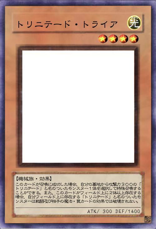 | このカードが召喚に成功した場合、自分の墓地から攻撃力300の「トリニテード」と名のついたモンスター1体を選択して特殊召喚することができる。また、このカードがフィールド上に2体以上存在する場合、自分フィールド上に存在する「トリニテード」と名のついたモンスターは戦闘及び相手の魔法・罠カードの効果では破壊されない。 | |||