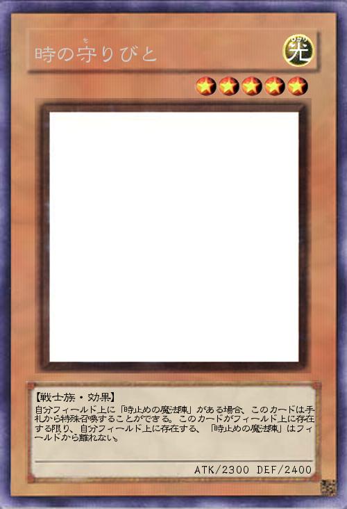 | 自分フィールド上に「時止めの魔法陣」がある場合、このカードは手札から特殊召喚することができる。このカードがフィールド上に存在する限り、自分フィールド上に存在する、「時止めの魔法陣」はフィールドから離れない。 | |||