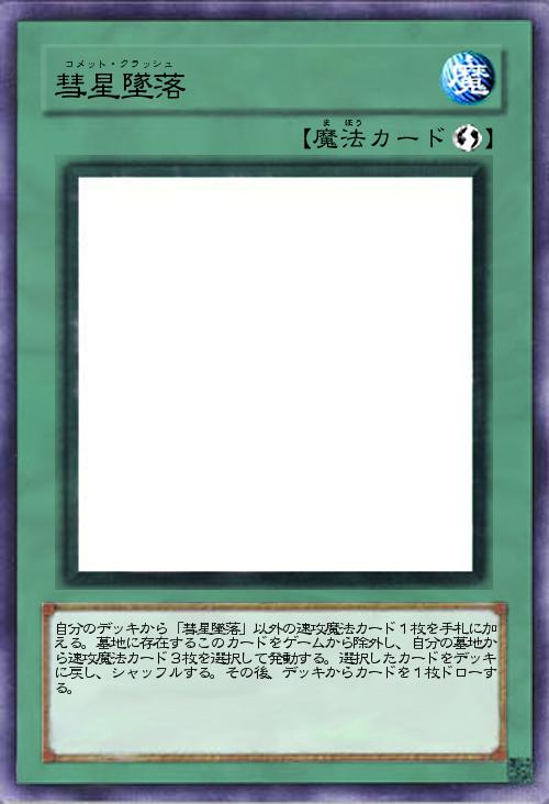 | 自分のデッキから「彗星墜落」以外の速攻魔法カード1枚を手札に加える。墓地に存在するこのカードをゲームから除外し、自分の墓地から速攻魔法カード3枚を選択して発動する。選択したカードをデッキに戻し、シャッフルする。その後、デッキからカードを1枚ドローする。 | |||